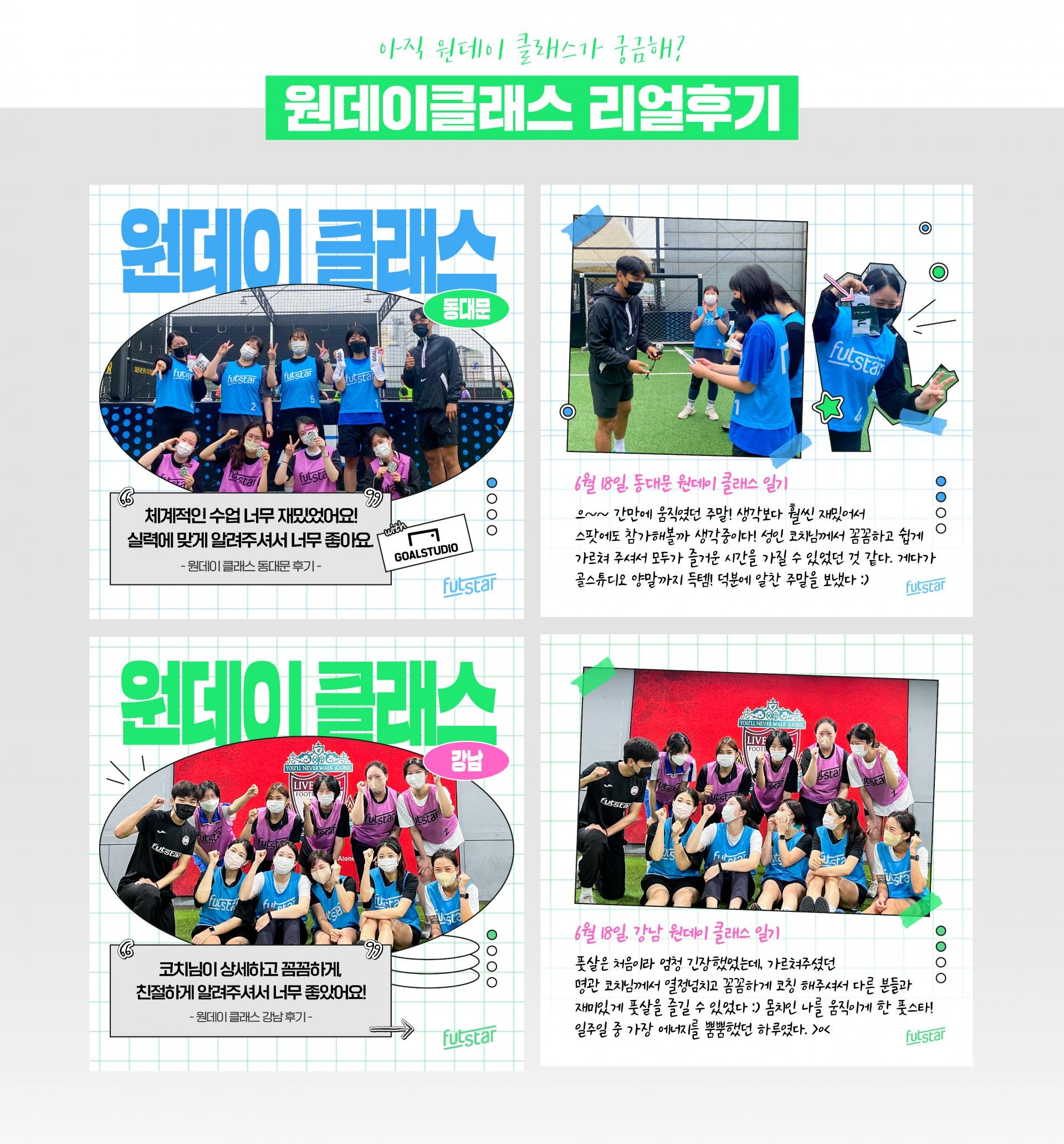 | 풋스타는 부상 방지를 및 안전을 최우선시 하고 있습니다. 부득이하게 훈련 중 발생 되는 부상에 대한 책임은 본인에게 있으며 클래스 참여시 보험 가입을 적극 권장 드립니다. 생활체육인 상해공제 원데이레저보험 |