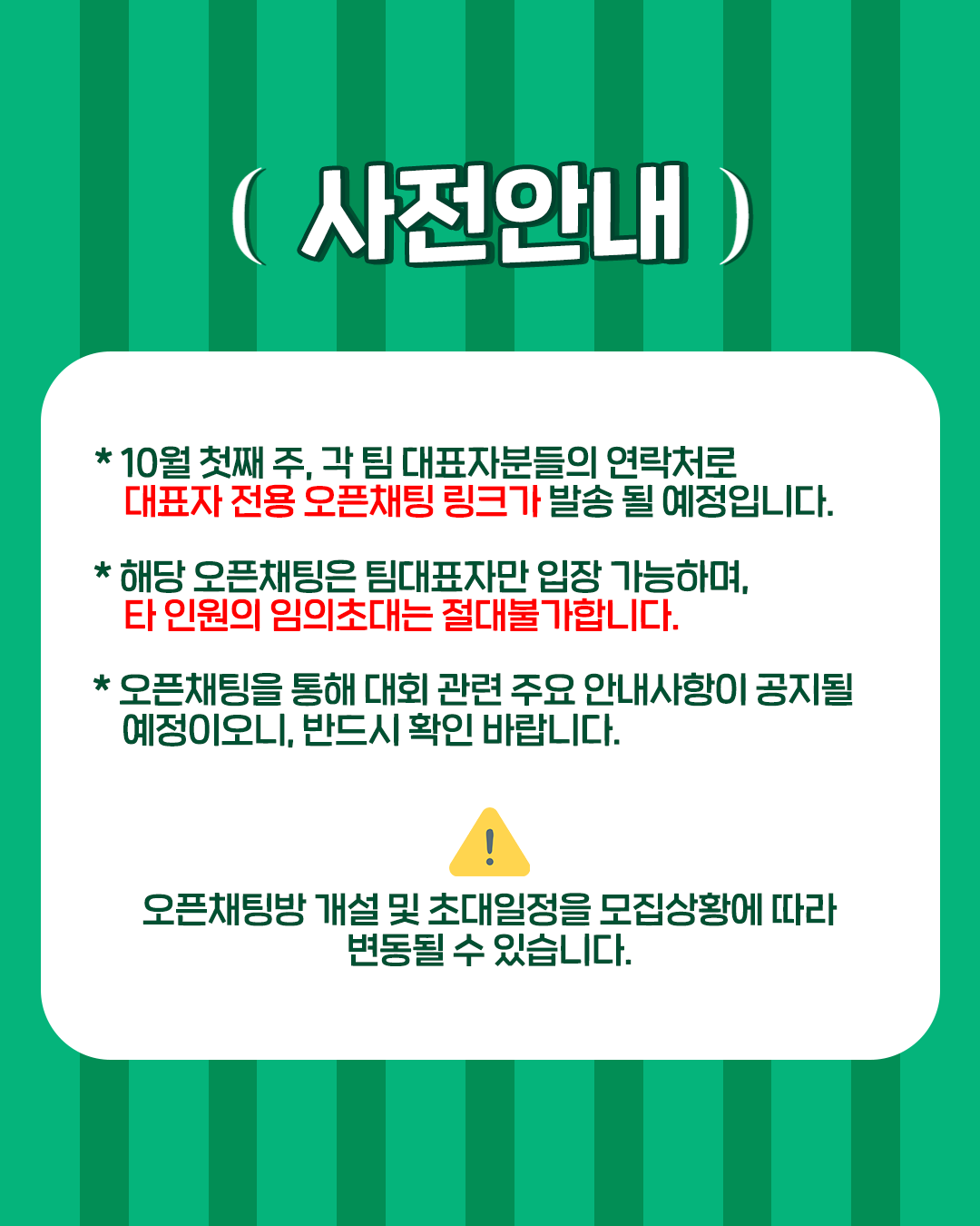 2) 해당 오픈채팅은 팀대표자만 입장 가능하며, 타 인원의 임의초대는 절대불가합니다.