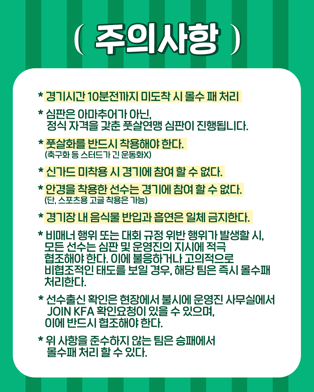 8) 선수출신 확인은 현장에서 불시에 운영진 사무실에서 Join KFA 확인요청이 있을 수있으며, 이에 반드시 협조해야 한다.
